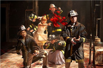 John Musial’s production both presents the spectacle of the fire and the personal stories of those citizens affected by the fire. Emigres struggling to find their children, a judge seeking to save his family  and the brave firefighters and a corrupt alderman have their adventures dramatized in this ambitious and gorgeous and physically stunning production. Mike Durst’s lighting on John Dalton’s multiple-layered set with chilling sound design by Josh Horvath and Ray Nardelli created the illusions of fire and physical destruction that added depth to the emotional reaction of the city dwellers.