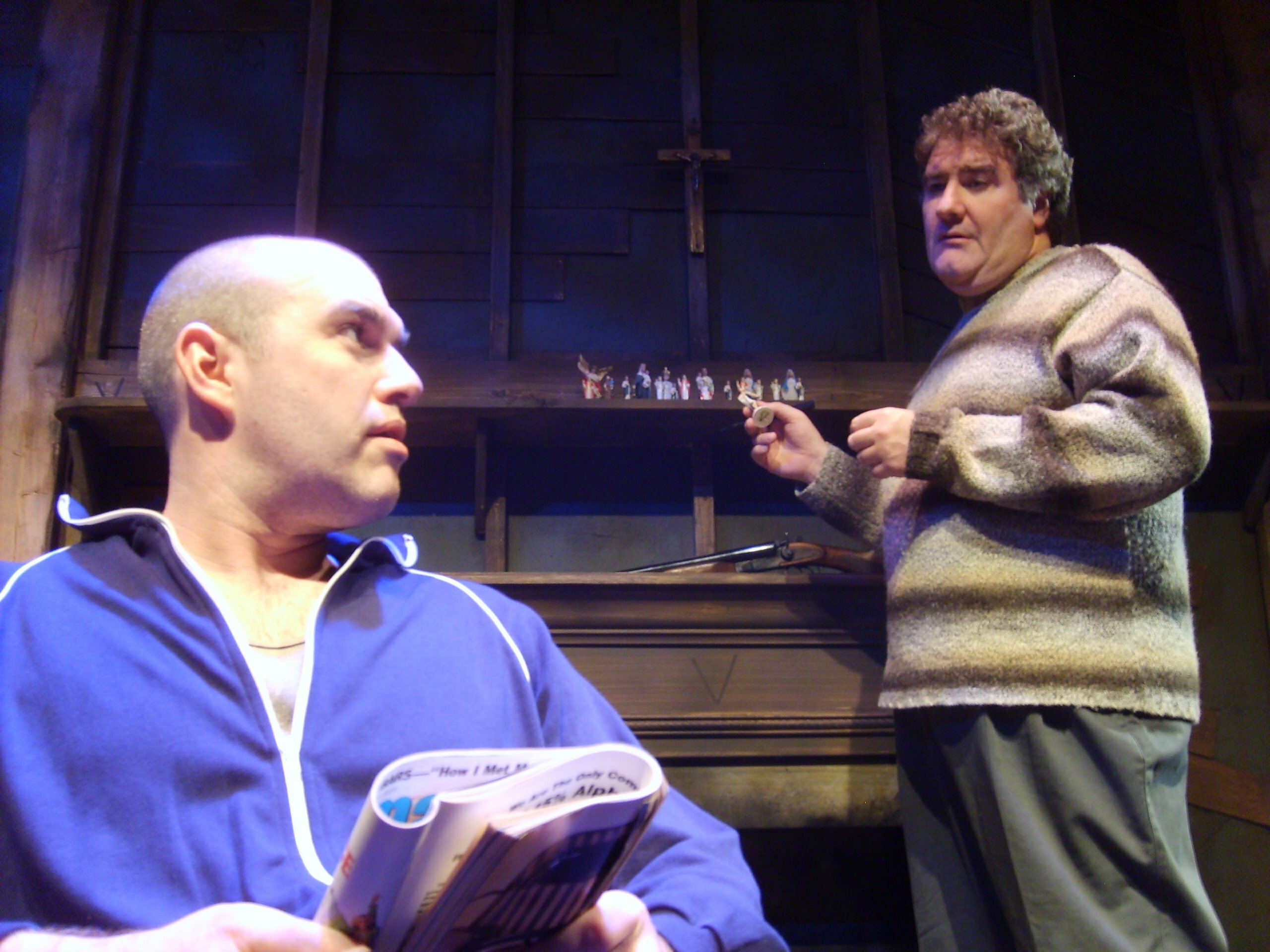 We meet the brothers Connor – Coleman Connor (John Gawlik) and Valene Connor (John Kelly Connolly) the bachelors who argue and fight over everything from eating chips to drinking poteen. Coleman is the broke brother and Valene is the moneyed brother who is obsessed with collecting small religious figurines. Coleman is the brother filled with seething aggression just waiting to explode. Early on we learn that Coleman ‘accidentally’ blew off his father’s head. Coleman’s only interests seems to be eating and irritating his brother.