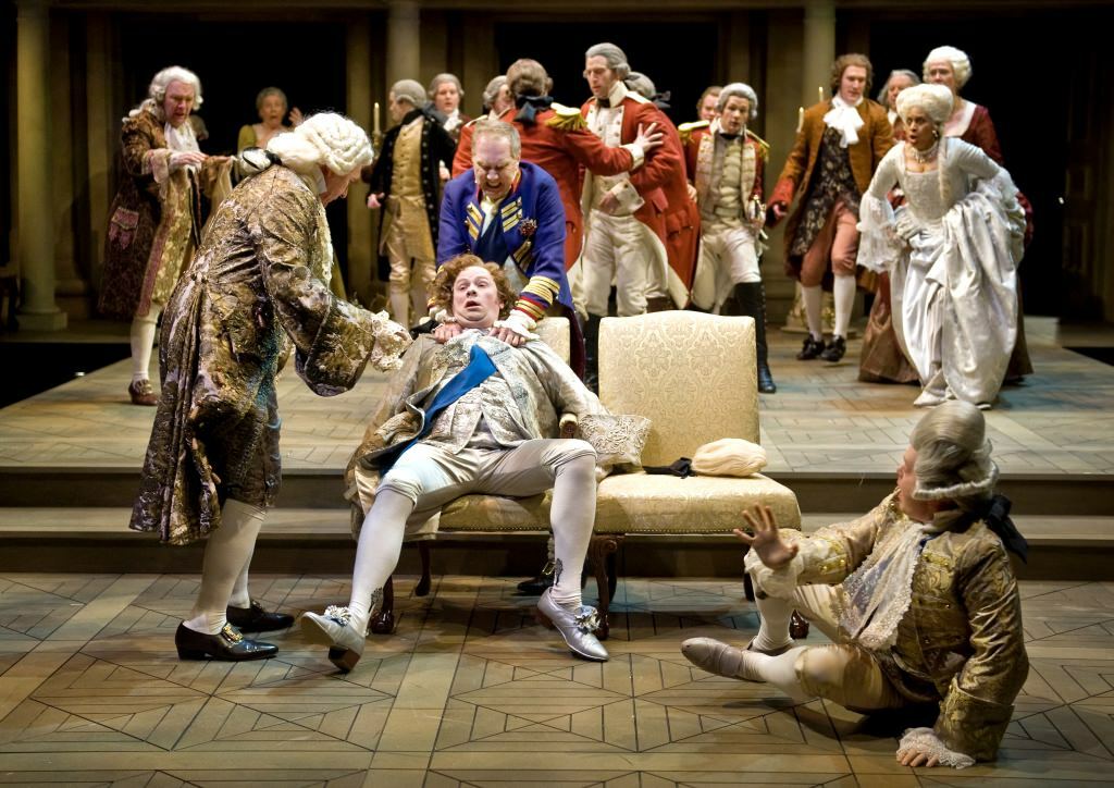 And, frankly, I found the decisions regarding the political parties in the play simplistic.  It sort of came down to “Tories good, Whigs bad,” which, I think, is far from the truth in the text.  To me, the two sides are closer to Brutus and Caesar than to Richard and Richmond.  The Tories are more conservative, the Whigs more progressive, but they both want what they believe will be best for their country.  Though not without the typical hypocrisy that comes with politics: the Tories, who typically want a strong monarch, wish to curtail the powers the Regent will have; while the Whigs, who are not as royalist as their Tory counterparts, want the Prince as strong as possible.  Why is this?  Ultimately, because Pitt will lose his power as Prime Minister if the Whigs take over the government; and Charles Fox, the leader of the Whigs, will suddenly become PM himself.  These men are not saints.  And yet, director Penny Metropulos decided to have this uncomplicated – not to say incorrect – reading of the text.  Pitt was this noble general who was only looking out for the King, and Fox was a dirty, scheming fiend.  There was not enough gray.The Madness of George III at Chicago Shakespeare