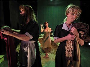 The two maids (sisters actually) role-play their fantasies concerning The Mistress. These games feature one sister playing The Mistress as the other sister plays herself. The roles then are reversed. We see how the line between admiration, love, contempt and loathing becomes obscured during the role-playing. Playwright Genet gives each of the maids—Rich Logan (Solenge) and her little sister Claire (John Arthur Lewis) long speeches that vividly depict their emotional shifts that become tedious and redundant quickly. This was caused by starting the play at a high emotional peek leaving no where to go. At first I was fascinated with the writing and the paranoia and obsession expressed by the servants. Slowly we hear about a possible crime committed upon the Mistress’ lover. Was it done by one of the maids? The rambling speeches become hard to concentrate on.