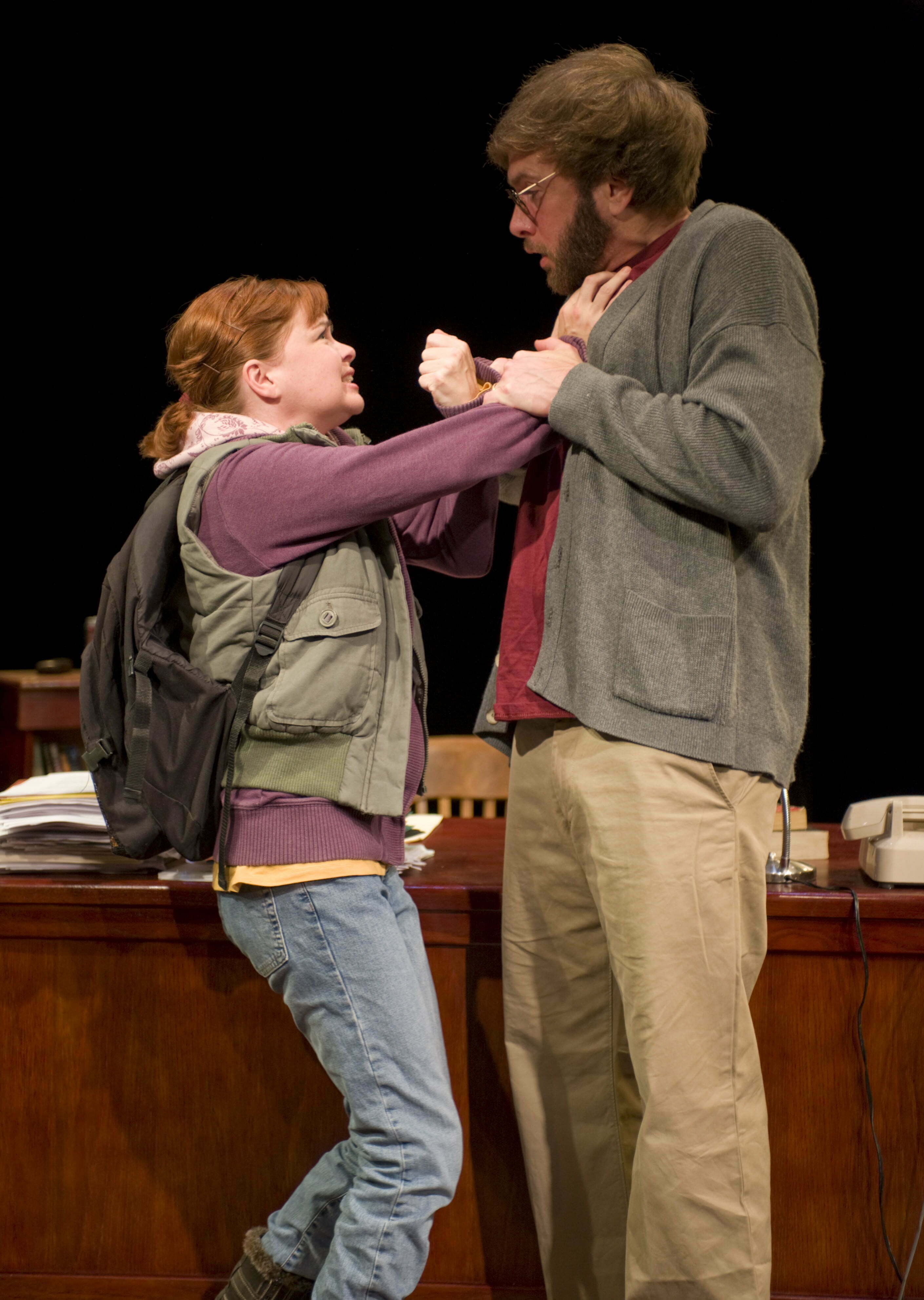 Carol claims she can’t understand John’s classes claiming that she must be stupid. John is an arrogant, self-righteous academic who actually questions the merit of college. John falls into Carol’s feminist, ant-male, anti-power agenda as the seemingly sweet student is really a mean-spirited idealist bent on entrapping John in an effort to destroy him. She claims sexual harassment by John.