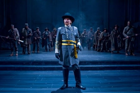 The cavernous setpiece of dull gray, able to change with lightning pace to keep tract with the multitude of stories, at times swallows the intimacy of these relationships. I could easily see this being done at half scale in a smaller theatre where no seat is unable to see the brutal resolve on the faces of the young men, the anguish on the face of the women or the trepidation mingled with joy on the face of a freed slave. Groener’s Sherman stands out just as it should, bringing to life a man fascinatingly balanced between a cruel pragmaticism and a seething need for vengeance for those who brought war to his Union (he was actually sympathetic to the South’s enslavement).