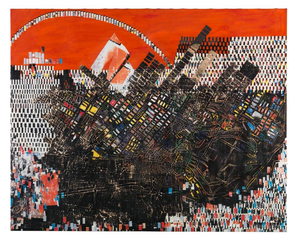 In 2000, Bradford completed the minimalist Enter and Exit the New Negro (2000), considered by many to be his first important piece. Filled entirely with singed perm-wave end papers that are endlessly multiplied on layers of multi-hued white acrylic gel, Enter and Exit is simultaneously filled with both serenity and angst. Uniform and repetitive, much like project housing, Bradford is embellishing the American perception that lower class and inner city individuals are viewed as “all the same.”