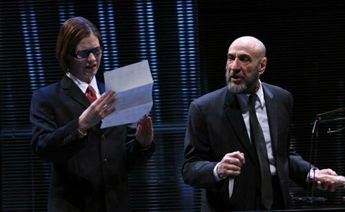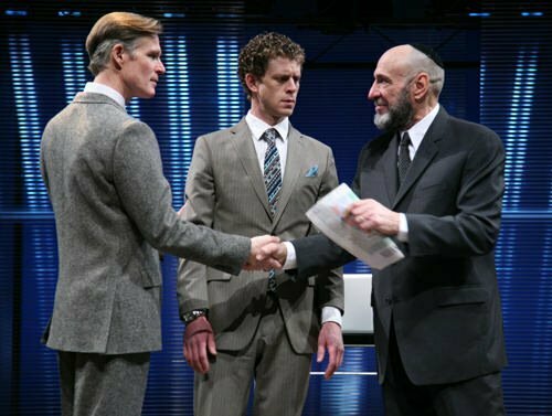 Darko Tresnjak has decided to set this particular production in the present-day world of Wall Street, fratty MBAs and trendy technology.  That’s fine, in principle: whether using the traditional setting of a Shakespeare play or not is irrelevant, so long as the new setting is for a reason, is used well, and enhances some aspect of the piece.   Unfortunately, the modern-day setting was employed more as a gimmick than anything else, with Portia’s chests being MacBook Pros instead of metal, and people occasionally calling each other on cell phones.  It did emphasize the greed of the Venetians, but their greed is hardly the greed of a Wall Street banker, who loves money purely for itself – indeed, that is more Shylock than the Venetians, who spend it instead of hoarding it on the pleasures of life till they are no longer rich.  To be sure, laptops-as-chests is a novel idea, but the sound effects for each computer, and especially the videos, are so grating that they only emphasize the extent to which the gimmick doesn’t work: USB thumb drives as “keys” is just so uninteresting.