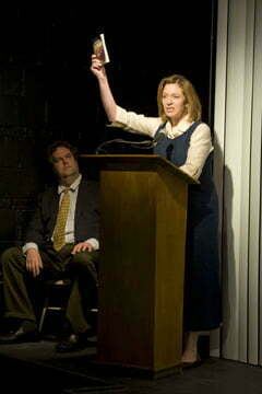 And the characters are fleshed out, as well. None of them lack humanity: each is human in his or her humility, pride, cleverness, compassion, cruelty. No one feels like a synecdoche, someone whose presence only represents a type or a group. Although Vera (played admirably by Caroline Neff, in her Next Theatre debut) does seem wise beyond her years: she is an exceptionally precocious 16. At the same time, even though she has complex ideas and uses powerful language, her “movement” is ultimately something of a failure – as if the author is saying, she’s not all that clever after all. She is idealistic, but her idealism is flawed, which gives a character that may have fallen into facility real depth. Tobin also delivers a powerful monologue in the second act of the play that reminded me, for some reason, of the monologue about Iraqi kites in The Distance from Here: I think because, in the middle of all this grime, this grit and hellishness going on – with nothing but dialogue – there suddenly appears a moment of stillness and beauty . . . and pain, and white-hot truth. It’s a powerful moment, in a play that has no lack of them.
