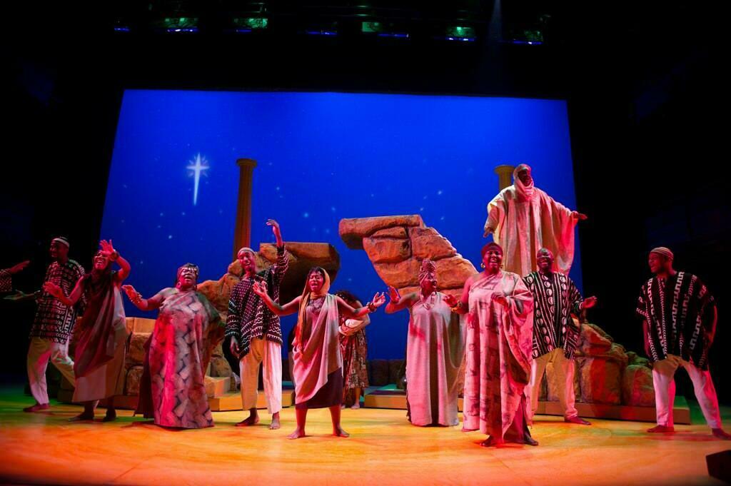 Alexi J. Rogers leads the excellent cast of singers who produced sweet harmonies and rich solos nailing all the emotions of the nativity story. A blend of gospel, blues, traditional Christmas tunes with hints of African rhythms, Jaret Landon’s deeply felt music raises the spirits of the season. We hear favorites like “Oh Come All Ye Faithful,” Silent Night,” “We Three Kings’ and “Go Tell it on the Mountain” with sparkling blues-orientated arrangements. This 90 minute song fest is an engrossing holiday treat rich in originality from an African-American tradition. It’ll lift your spirits.