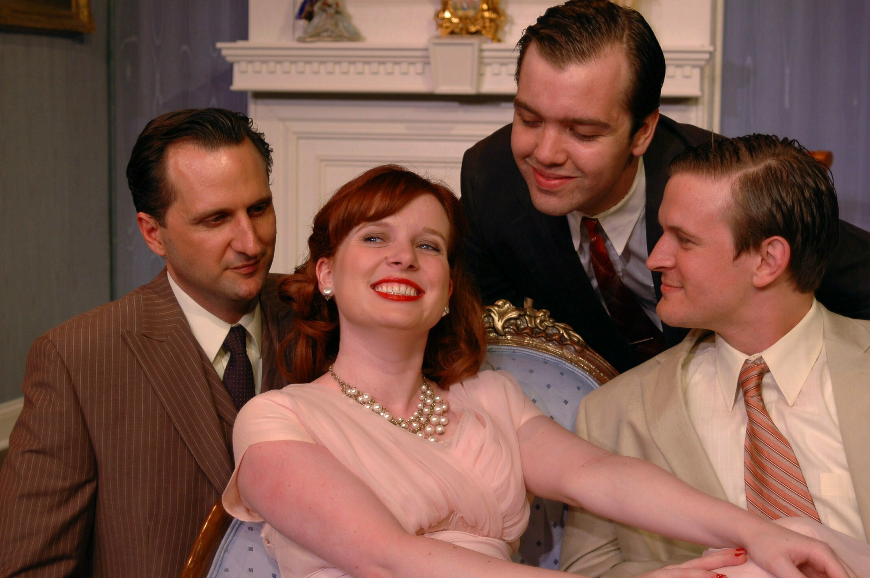 A day before her second marriage to a self-made business man, haughty socialite Tracy Lord (Laura McClain in full red hair with imitations of Hepburn) is a most assured, even cocky woman about her future. She is in command and lives almost to perfection in her manner and confidence. However, the arrival of her ex-husband, Dexter (the urbane Kevin Anderson) and a crude, worldly tabloid journalist, Mike Connor (the everyman Josh Hambrock) shakes Tracy’s vision of herself to her core. We see Tracy slowly melt down as Dexter, her estranged father Seth (Tom Viskocil) and the outspoken journalist through sharp and caustic repartee and a compromising champagne-induced event begin to crack Tracy’s tough veneer. Once Laura McClain settled into her role, she was terrific as Tracy.
