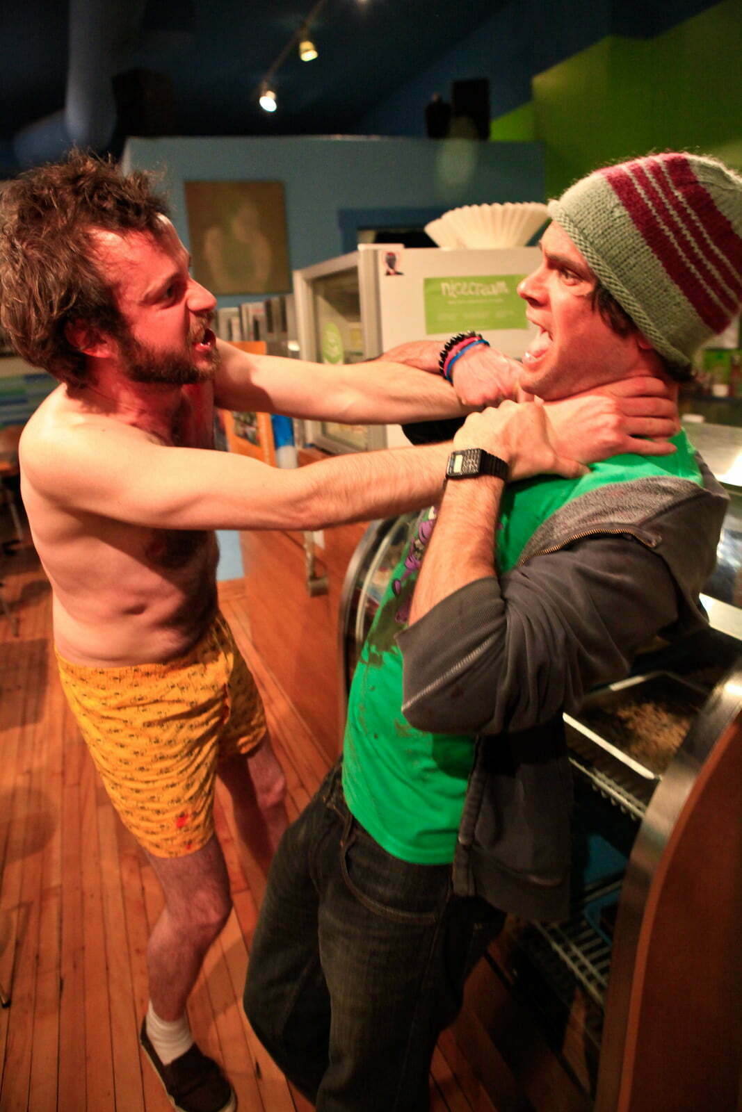 What this production needs is another space. While it is great to do site-specific work, if the audience is uncomfortable and unable to see, it is nearly impossible to enjoy the show regardless of how strong the work is. If you are going to see this show, it is best to get there early because if you are in the back of the café you are going to miss a lot of the action. I found myself peeking around the head of someone in front of me and trying to decipher what the people at the front of the café were laughing about. Although there are some truly hilarious moments, the piece is somehow unsatisfying due to some curious character choices, pacing, and just a general inability to enjoy the show from where I was watching. With a few re-writes and a new space, this show may be more enjoyable.