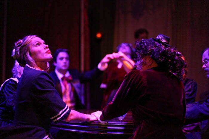 Beliefs and actual involvement with the spirits collide in this very smart plotted story that features excellent production values with nicely timed lighting (by Jordan Kardasz0 and sound (by Michael Huey) with exquisite magic (designed by Brett Schneider). Live piano music played by Marty Scanlon added fine underscoring to the work. These techniques totally engage us as we journey with the characters in wonderment as to what will happen next. Rich characters, a surprising plot twists and an unexpected ending mark The Spirit Play as a most entertaining new mystery that keeps us guessing throughout. Non-believers will admire the stage craft, believers will be reinforced in their faith as the spirits mingle with the charlatans. Both will find The Spirit Play as a sophisticated, genuine mystery in the best traditions of 19th Century melodrama. Emily Schwartz and her creatives at The Strange Tree Group (including the fine direction by Jimmy McDermott) have matured into fine storytellers. See this original show and be impressed by a fresh voiced Group of artists.