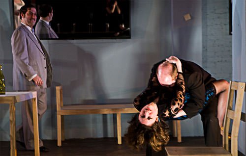 The action takes place in the Bridegroom’s house, which he has furnished with self-made (and poorly glued) furniture. His Mother (Ariel Brenner) is in attendance, as well as the Bride’s Father (Kirk Anderson), and a smattering of other friends and relatives. As the Bridegroom’s Mother serves her courses, from the fish plate to the deserts, conversation is carefully navigated by proposing a toast whenever the Bride’s Father gets to a particularly crude part of one of his stories. Dancing becomes inevitable, as an exit to conversation, and a drunken bacchanal ensues. Everyone ends up dancing with people they rather shouldn’t, and rather more vigorously than is appropriate. By the end of the play, each of the party members has insulted at least one of their companions, some to the extent of physical assault.