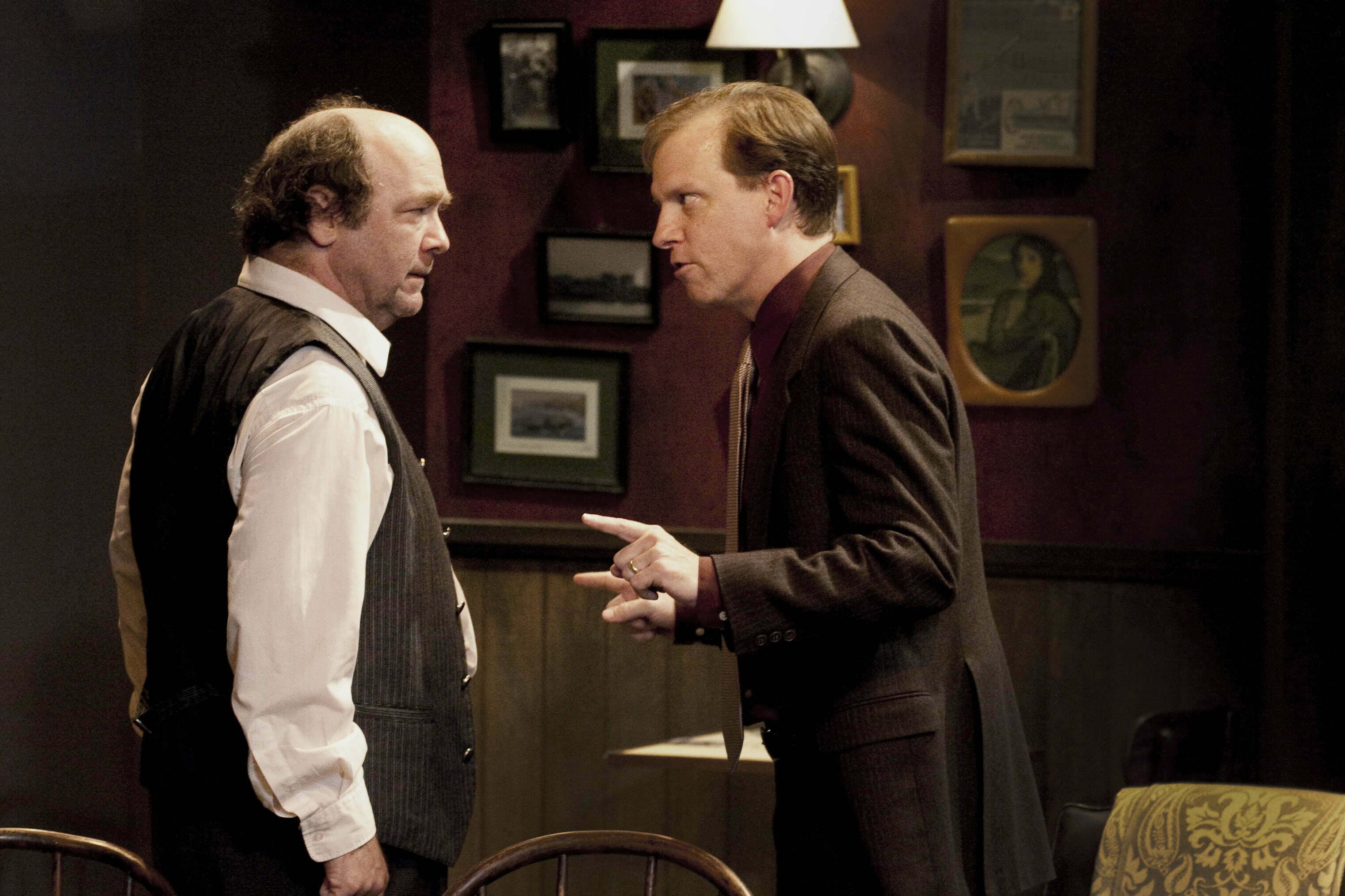 Seanachai (Shawn-uh-kee: Gaelic for storyteller) Theatre Company loves to tell Irish ghost stories and Conor McPherson’s The Weir is a fine example of that art form. Director Matt Miller has assembles a terrific group of actors deftly sporting rich Irish brogues (dialect coaching by Barbara Zahora). Utilizing a expert Irish pub set (design by Robert Groth and Jennifer J. Thusing), we meet a fifty something single auto mechanic show owner, Jack (Brad Armacost), whose thirst knows no boundaries. He helps himself to a pint while the thirty something single pun owner, Brendan (Brad Smith) cleans the rural pub.