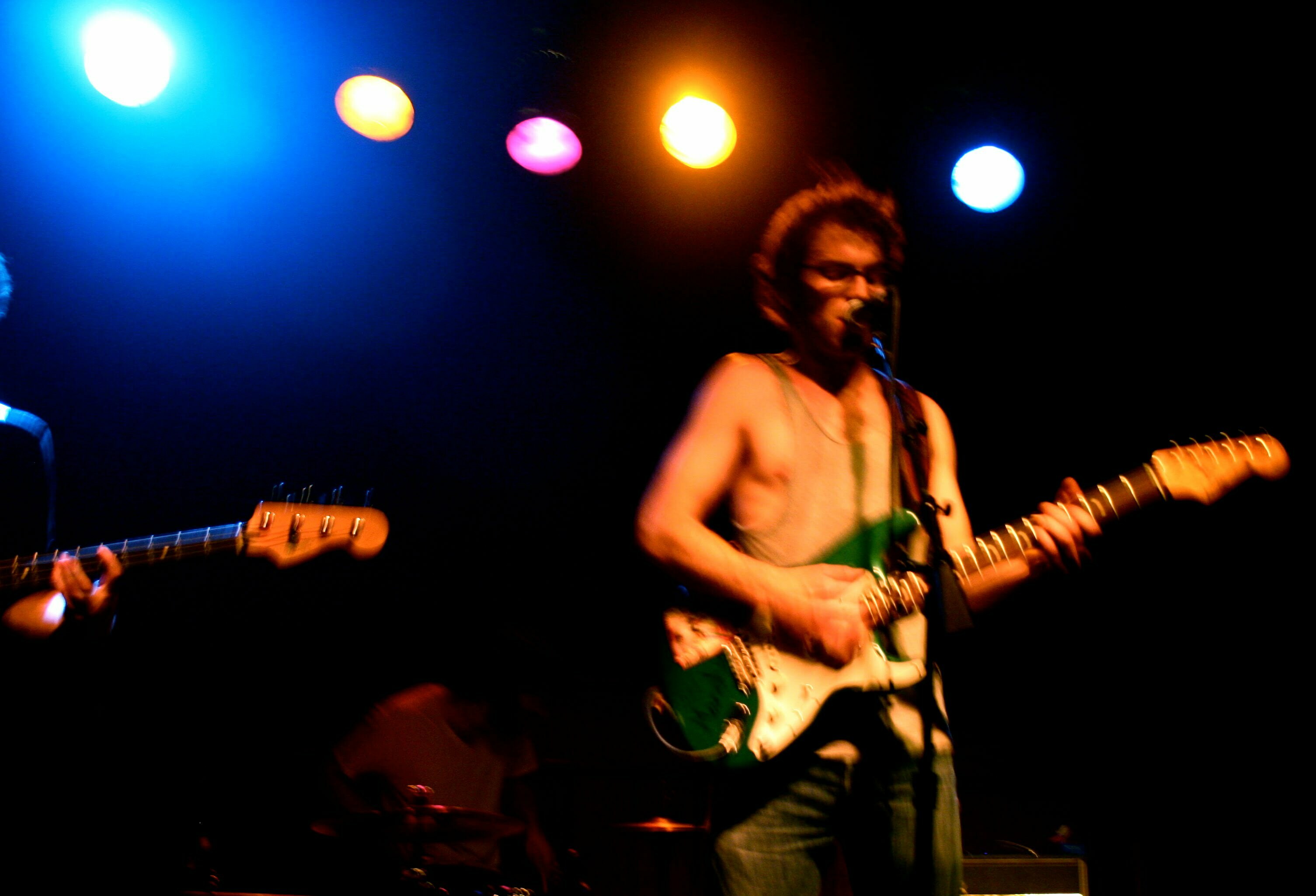 And then it came time for Theo’s set. He stripped off his loose-hanging button-up shirt and grabbed his forest green Strat wearing a gray tank top and jeans. Jack Stratton sat down at the drums, and Joe, well, he didn’t need to move too much. The three of them immediately launched into several new songs, presumably on the debut album Theo’s recording right now, each of them very strong and containing what one has come to expect from Theo: good lyrics, nice hooks, excellent chord progressions. Theo writes like he talks, so the colloquial nature of his lyrics make the songs very approachable while remaining catchy and smart. As an example, “Brooklyn” is a song about going home after an absence, in this case one spent in Michigan, which he calls “true like New York but you lie like L.A.” “This long island is a desolate place,” he sings, comparing the city to where he now calls home.