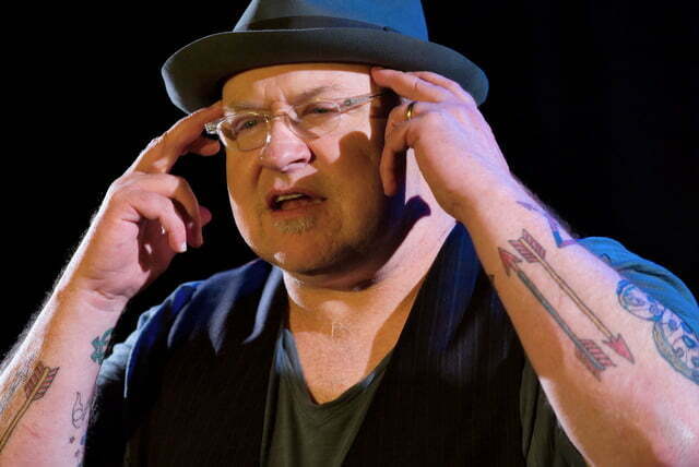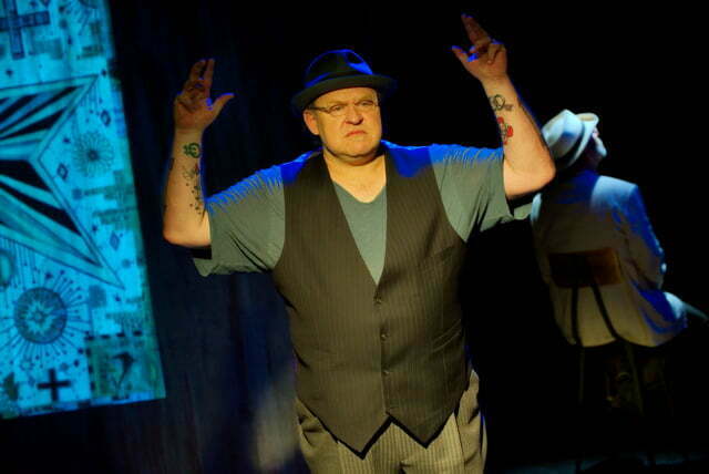 I initially felt as though there was supposed to be a plotline because of the way in which it transitioned from the video collage to the music to the scene between Mr. Fitzpatrick and the only other speaking actor in the show (Stan Klein), but I quickly realized this show is about stories. These stories are told in a humorous and touching manner by writer/actor Tony Fitzpatrick, using language that is poetic and vibrant imagery that makes the audience feel like they have been transported into these situations. There are few great storytellers in this day and age, and Mr. Fitzpatrick has an undeniable gift to engage an audience, especially for the two hour duration of the show during which he does most of the speaking. His language is beautifully supplemented by the folk music of guitarist John Rice and vocalist Kat Eggleston, whose musicianship is stellar. This gives the whole piece of a feel of being around the campfire; trading stories, singing songs, and learning a little bit more about one another.