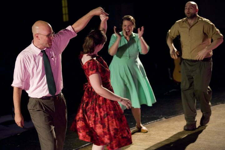 For its part, Phil Maniaci’s original music—which comprises 25 songs ranging from bluegrass to rockabilly to subtle hints of gospel—is expressive and succeeds in anchoring the show’s otherwise wayward tone and tenor. Dennis Frymire, for instance, shows some sizable crooning chops in the laid-back country song ‘Is This Home?’. And the tiny cast of four manage to blend nicely together for the second act’s elegiac choral rendition of ‘Freezin’ on the Water.’ But the tendency of Uptown Opera’s lyrics to rest too forcibly on the downbeat infuses the score with an oddly metronomic regularity. Which might be redeemable were they intricate or revealing. Unfortunately, they’re of the “She’s so fine/ I need to make her mine”-variety, including a head-banging attempt to rhyme ‘mate’ with ‘conversate.’