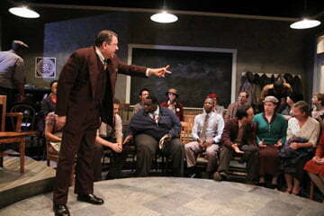 The American Blues Theater, under tight direction by Kimberly Senior, has mounted a worthy production of Waiting For Lefty. Told in a series of vignettes structured around a taxi union meeting to discuss a strike in NYC, the work dramatizes the greed and exploitation of workers by big business. Odets was a socialist/communist who admired the Russian model in the 1930’s. He used Lefty to dramatize and promote his anti-capitalist beliefs by exposing the exploitation in human terms.