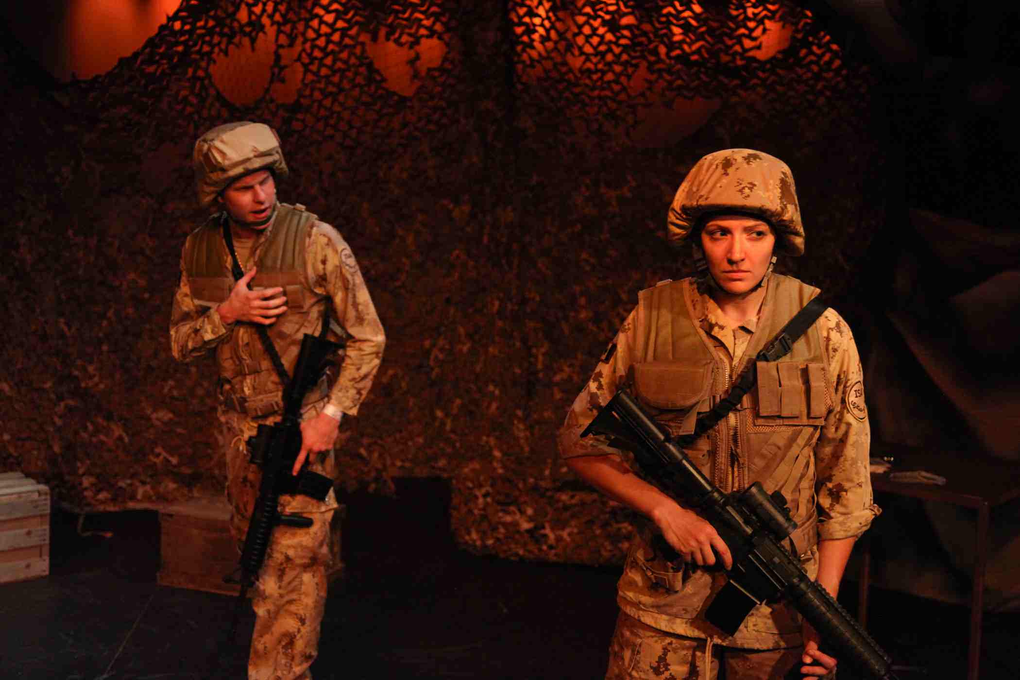 At the center of the escalating tensions leading up to the day of the battle is a love triangle between Corporal Tanya Young (Courtney Jones), Sergeant Stephen Hughes (Billy Fenderson) and Private Jonny Henderson (Michael Finley). Hughes is a cocky, even menacing, figure with an anarchic wit and wolfish smile. Henderson, by contrast, is a baby-faced, small-town boy eager to rush headlong into the first flirtation that comes his way. Young, as the link between them, finds herself drawn ineluctably to both despite her better senses. But hindsight is, as they say, 20/20, and it’s only after she’s slept with both of them that she fully comes to regret her decisions—especially as tensions soon thereafter escalate between Hughes and Henderson.